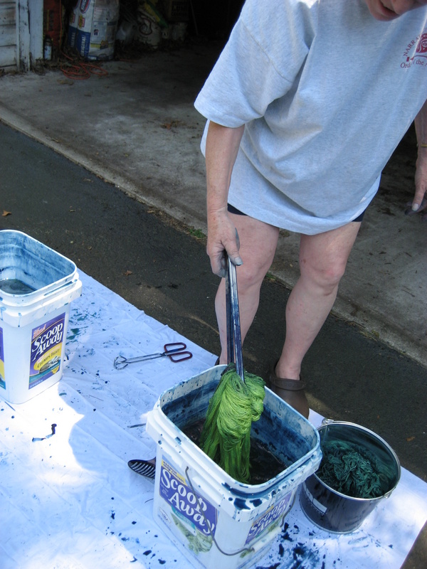 This is the color of the dyed fiber when it comes out of the bath. Seconds later it turns blue as it oxidizes, as seen in the bucket.